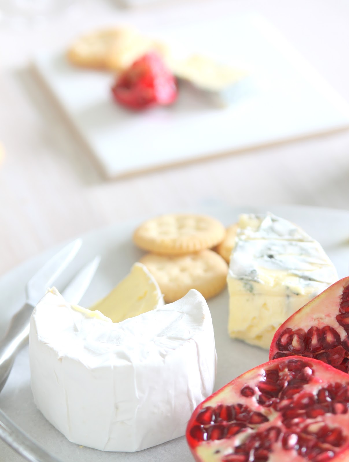 Näissä kuvissa on rento juusto- ja keksipöytä, jonka kattaus koostuu