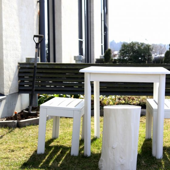 Istuinryhmä koostuu pöydästä sekä neljästä selkänojattomasta valkoisesta penkistä,