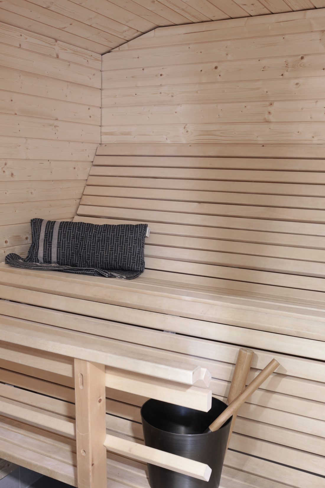 Uusia panelointeja, lämminvesivaraajaa ja lattiaa lukuun ottamatta myös saunan elementit on säästetty vanhasta saunasta. Kaarevat lauteet ja vuolukivikiuas olivat molemmat paitsi varsin uusia, myös erittäin laadukkaita ja hyvässä kunnossa. En ole lainkaan ahkera saunoja, joten näin kalliissa projektissa päätin, että sauna on se tila, jossa säästän muutaman tonnin. Ja olen valintaani tyytyväinen. Uusi koivupanelointi sopii täydellisesti yhteen lauteiden kanssa ja kiuas antaa vuolukivien pesun ja kevyen hiomisen jälkeen erityisen pehmeät ja ihanan kosteat löylyt.