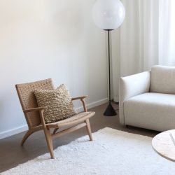 Se ”jokin” alkoi sitten tapahtua loppukesästä, kun ostin tori.fi:stä huoneeseen Ikean Söderhamn-sohvan. Halusimme huoneeseen harmaan Söderhamnin, mutta koska sohva tuli käytettynä, tyydyimme toistaiseksi siinä olleeseen luonnonvalkoiseen kankaaseen. Ja kieltämättä pidän siitä, että huoneessa on nyt kaiken kaikkiaan luonnollisempia, kellertäviä sävyjä. Sohvan kaveriksi ostin Askon alesta Finarten Nirvana-villamaton. Matto on ollut pitkäaikainen unelmani, ja se sopii tähän tilaan täydellisesti. Villainen seinävaate, joita löysin keväällä UFFin kirppikseltä kaksin kappalein, sopii tähän sävymaailman myös hyvin.